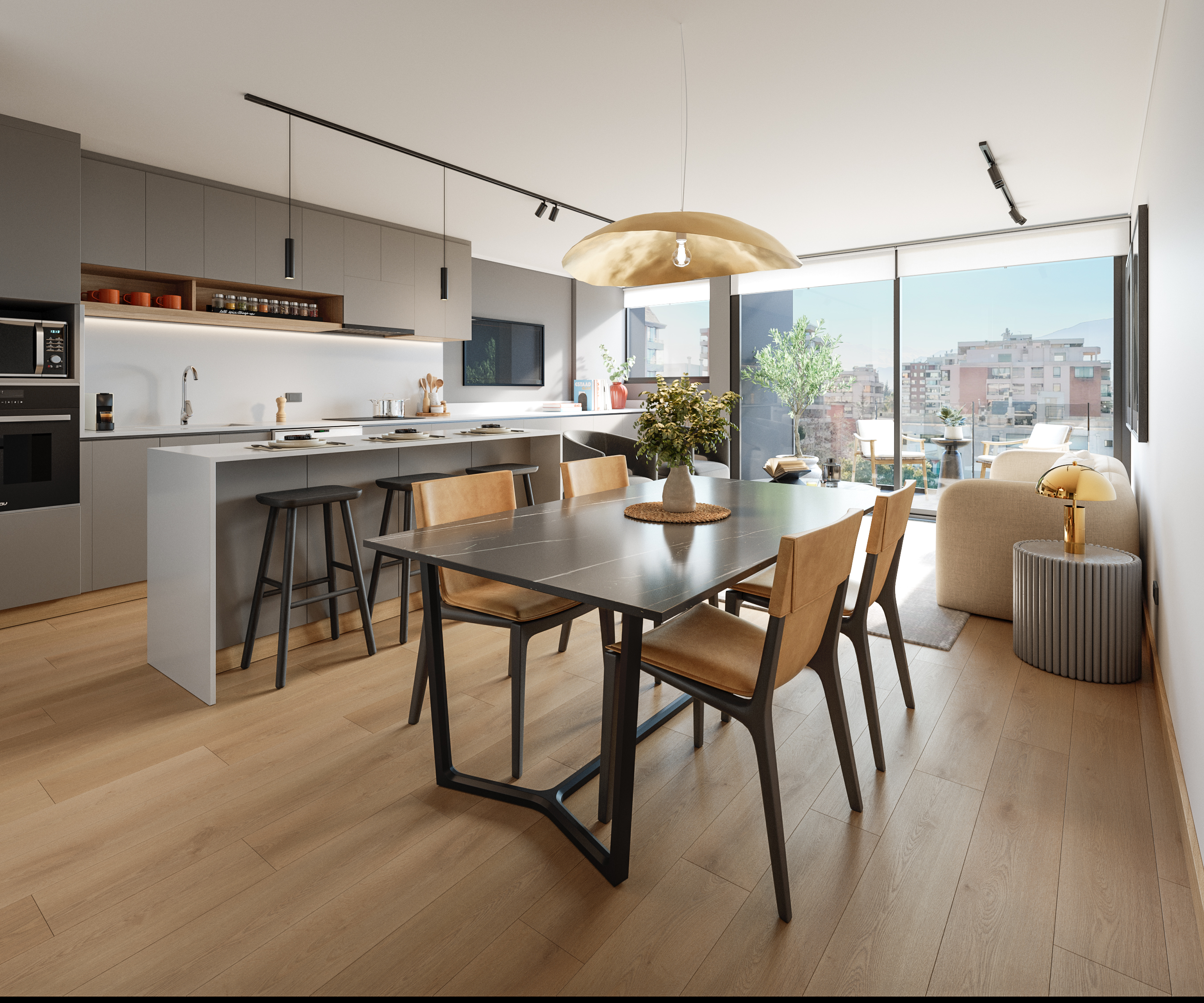 Arquitectura contemporánea, con terrazas de vistas despejadas - poco comunes en Providencia – no solo miran hacia afuera: se conectan con el verde, amplían la experiencia interior y permiten habitar la ciudad con otra calidad.